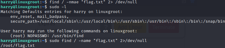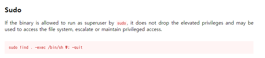 sudo -l 명령어를 통해 권한을 확인하니 find의 명령의 경우 패스워드 사용없이 root의 권한으로 사용할 수 있어보인다.