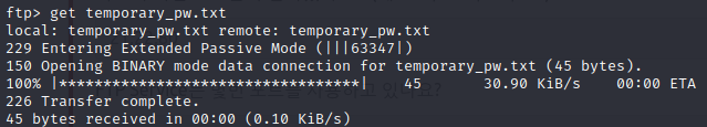 FTP에 Anonymous로 로그인하게 되면 temporary_pw.txt라는 파일을 발견할 수 있었고, 아래와 같이 get 명령어를 통해 local로 복사한다.