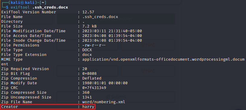 exiftool을 활용하여 docx파일의 정보에 대해 출력한 결과 만든이는 harry임을 알 수 있다.
