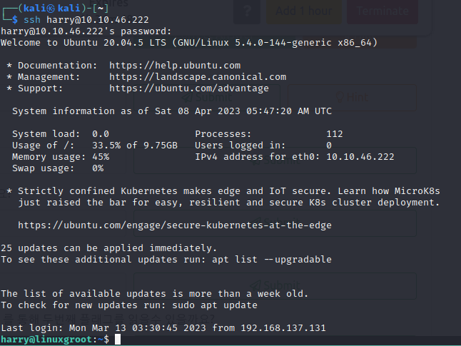 그럼 SSH ID(harry), PW(catchme!@#)를 알았으니 접속해보자.