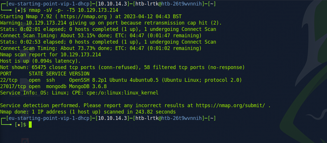 확인해보니, SSH와 mongoDB가 열려있는 것을 확인할 수 있다.