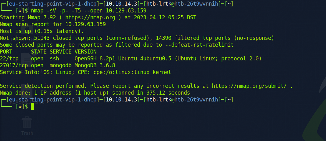 확인해보니, SSH와 mongoDB가 열려있는 것을 확인할 수 있다.