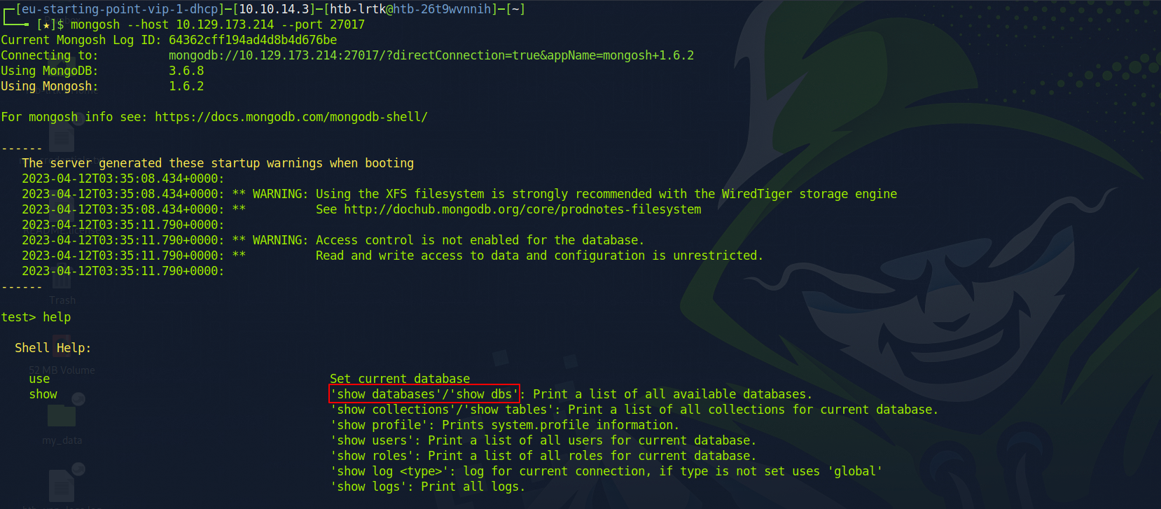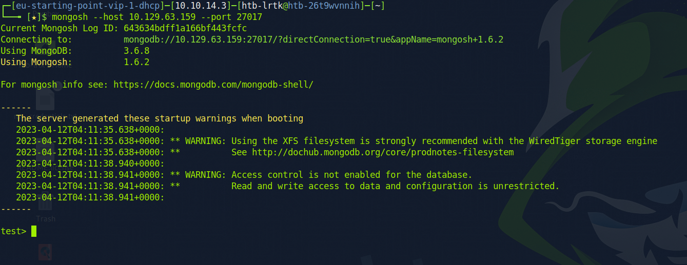 mongosh를 이용하여 공격 대상의 MongoDB에 접근 시도하였다.