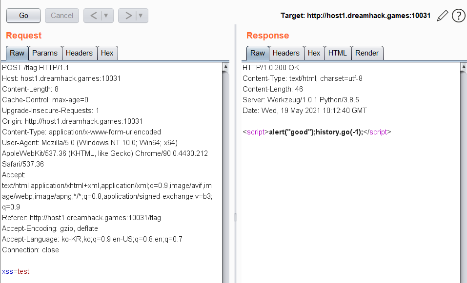 xss 파라미터에 test 입력 후 전송 시, "good"이라는 알림창이 뜬다.