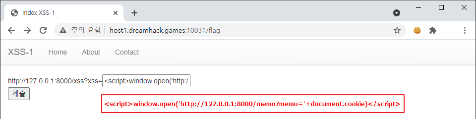 => 'http://127.0.0.1:8000/memo?memo={현재 로컬의 쿠키 값}' 페이지를 새 창으로 여는 스크립트 구문