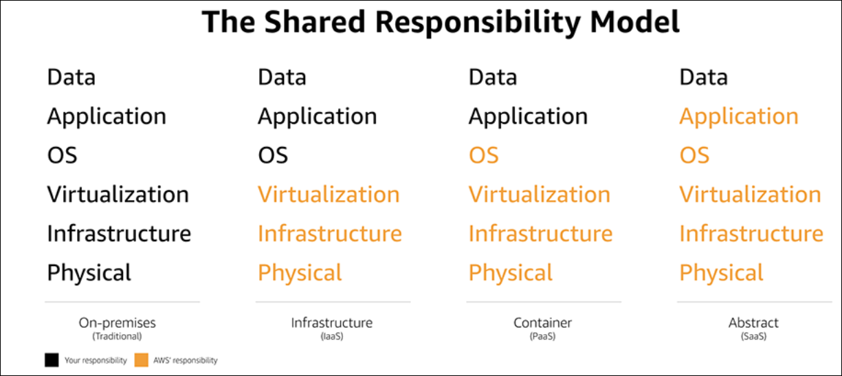 각 서비스별 주황 부분은 AWS 에서 책임이 있으며, 검은 글씨는 사용자측에 책임이 있다는 것이다.