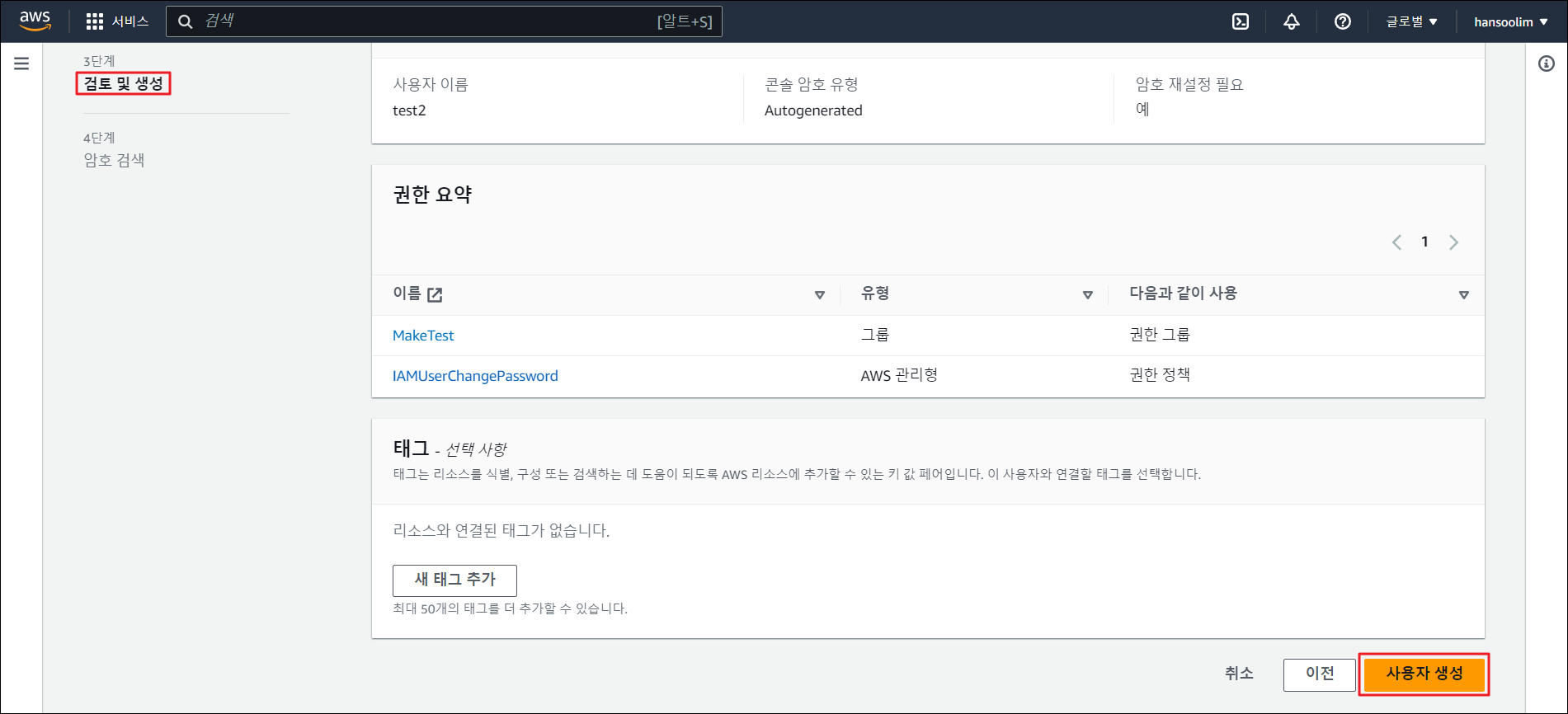 Season 1/기술 보안 AWS 클라우드 기본 기능 사용해보기!! 작성자 - 한수임 AWS ID 생성, EC2 생성, SSH 연결 등을 수행해 볼예정이다. 첫번째로 계정 생성해볼 것이다. AWS 홈페이지 로그인 후 계정 생성 버튼 눌러준다~ 계정 생성에는 큰 어려움 없기에 PASS 하도록 하겠따. IAM(Identity and Access management) 핵심에 관해 보겠다 - 사용자 : 사용자가 IAM에서 생성 및 엑세스 AWS 리소스에 필요한 권한을 부여 할 수 있다. - 그룹 : 사용자를 그룹에 추가할 수 있으며, 개별 사용자 대신 그룹에 권한을 부여할 수 있따. - 정책 : 사용자 또는 그룹에 대한 권한을 정의하는 JSON 문서이다. - 역할 : 사용자에게 AWS서비스에 액세스 할 수 있는 임시 권한을 부여하는데 사용한다. 4가지가 연계되어 사용자에 그룹을 설정하여 특정 정책을 통해 관리를 할 수 있따는 의미이다. 이제 사용자를 생성해 보겠다. 1. 검색을 통해 IAM을 검색한다 이후 사용자 탭 클릭 후 사용자 추가를 수행한다. 사용자 추가 클릭 시 기본 정보 작성한다. 이후 기본 정보 입력 후 다음 버튼으로 넘어간다. (특별히 설정해줄 내용이 없다.) 콘솔 기능 + Acess 기능 활성 화 후 기본 값응로 설정 한다. 이후에 그룹 생성을 해준다. 그룹 생성 시 생성할 이름 작성 후 그룹에서 사용가능할 서비스를 검색 후 선택 한다. 이후 생성된 그룹 이름 클릭 시 사용자 추가가 가능하다. 이후 검토 및 생성 단계 에서 사용자 생성 완료 버튼 클릭 하게되면 새로운 사용자가 생성된다. 이후 콘솔 암호가 생성 되며, 해당 암호는 다시 찾기가 어려워 표시 내용 확인 후 저장 할 것을 추천한다. 2. 이제 EC2 서버 생성 및 인스턴스 연결 해보도록 하겠따. 검색을 통해 EC2 검색 후 인스턴스 시작해 준다. 이후 생성할 이름을 설정한 후 익숙한 우분투로 실습 수행해보도록 하겠다. 더 많은 AMI 를 통해 다양한 서버를 확인할 수 있따. 우분투 중 사용할 버전을 선택하면 된다. (대신 기본으로 1대만 서버 무료이며, 추가적으로 구성할 경우 추가 금액이 산정된다고 하며, 초기에 12개월만 무료이기에 서비스 사용 시 잘 확인할 필요가 있다.) 인스턴스 유형은 서버의 크기를 나타내는데 1G 메모리로 설정하였따. 이후 새키페어 버튼을 클릭하여 새로운 키페어를 생성한다. 키페어 이름과, 파일 형식을 선택하면 되며, SSH와 PUTTY 접근 중 선택 하면된다. 이때 파일이 생성되는데 해당 파일은 다시 받기 어렵기에 한번에 저장을 잘 해두기를 바란다. 이후 네트워크 부분은 해당 기능을 통해 보안 설정 등을 수행할 수 있지만, 초기 생성에는 불필요 하므로 기본값으로 설정 후 인스턴스 시작을 하도록 하겠다. 아래 EC2_Web.pem 파일을 받을 수 있는것을 볼 수 있다. 이렇게 되면 인스턴스가 생성된 것을 볼 수 있따. 이후 인스턴스 정보들이 출력되며, 연결 버튼 클릭을 통해 콘솔로 접근이 가능 하다. 이후 인스턴스 연결할 방식이 나타나며, 바로 연결을 해보도록 하겠다. 연결 시 아래와 같이 콘솔 창이 보이게 되며, 우분투를 사용할 수 있게된다. 이후에는 SSH 연결, 인프라 구성 등 수행해 볼 예정이다. 공유하기 게시글 관리 MSS 저작자표시 비영리 (새창열림) 'Season 1 > 기술 보안' 카테고리의 다른 글 [Lambda] AWS 콘솔로그인 모바일 접속 제한 함수 만들기 (0) 2023.04.30 [Lambda] AWS 콘솔로그인 실패 횟수 제한 함수 만들기 (0) 2023.04.30 AWS 클라우드 기본 개념 알아보기! (0) 2023.04.30 FortiAnalyzer 쿼리 사용 (0) 2023.03.31 PARAMSPIDER을 이용한 URL 취약점 분석 (0) 2023.03.20 Contents 당신이 좋아할만한 콘텐츠 [Lambda] AWS 콘솔로그인 모바일 접속 제한 함수 만들기 2023.04.30 [Lambda] AWS 콘솔로그인 실패 횟수 제한 함수 만들기 2023.04.30 AWS 클라우드 기본 개념 알아보기! 2023.04.30 FortiAnalyzer 쿼리 사용 2023.03.31 댓글 0 + 이전 댓글 더보기