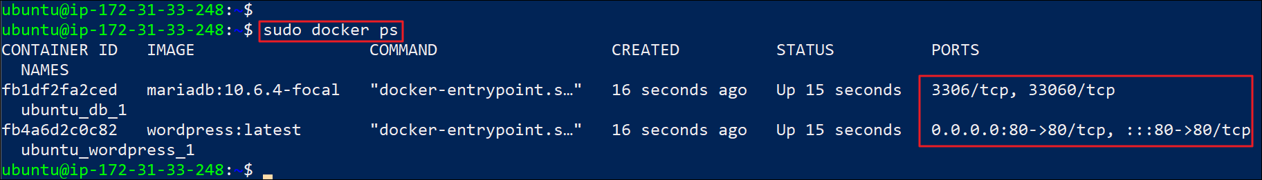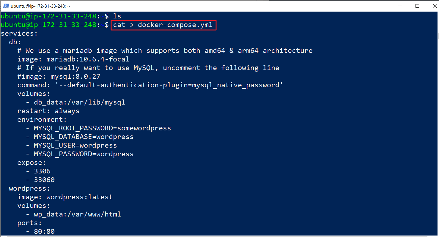 Season 1/기술 보안 AWS 클라우드 SSH 연결 후 도커로 워드프레스 연결 해보기!! 작성자 - 한수임 지난번에는 AWS 페이지에서 콘솔 접근을 해봤다면, 이번엔 윈도우에서 PowerShell과 Kali 리눅스를 통한 SSH 연결을 해볼 것이다. 어렵지 않으니 잘 따라오길 바란다!! 1. 이전에 생성한 키페어 파일을 VMware KaliLinux에 옮겨 줍니다. 이후 해당 파일에 읽기 권한을 부여해 줍니다! 해당 파일은 /EC2 라는 디렉터리 생성 후 안에 넣어주었으며, 윈도우에서 VMware로 Ctrl+C ,V 로 쉽게 옮길 수 있기에 생략 했습니다. chmod 400을 통해 키페어 파일에 읽기 권한 부여! 2. 이후 AWS 페이지의 SSH 클라이언트 에서 ssh 연결 명령어를 입력해 준다. 해당 명령어 Kali에 붙혀넣기 후 명령어 실행 하면 SSH 연결이 완료 된다. 이번에는 윈도우에서 PowerShell을 통해 연결해 보겠다. 윈도우에서 초기에 저장된 키페어 파일 경로에 이동 후 윈도우의 경우엔 상위 3개의 명령어 입력이 먼저 필요하다. (권한설정 용도) 이후에는 리눅스와 동일하게 명령어 수행하여 연결가능 하다. 이번에는 도커 컴포즈로 워드프레스 설치해볼 것이다. 1. sudo apt 명령어를 통해 업데이트를 수행해 준다. 2. 이후 docker 를 설치 한다. 3. docker-compose 설치 4. compose 설정 파일 수정 services: db: # We use a mariadb image which supports both amd64 & arm64 architecture image: mariadb:10.6.4-focal # If you really want to use MySQL, uncomment the following line #image: mysql:8.0.27 command: '--default-authentication-plugin=mysql_native_password' volumes: - db_data:/var/lib/mysql restart: always environment: - MYSQL_ROOT_PASSWORD=somewordpress - MYSQL_DATABASE=wordpress - MYSQL_USER=wordpress - MYSQL_PASSWORD=wordpress expose: - 3306 - 33060 wordpress: image: wordpress:latest volumes: - wp_data:/var/www/html ports: - 80:80 restart: always environment: - WORDPRESS_DB_HOST=db - WORDPRESS_DB_USER=wordpress - WORDPRESS_DB_PASSWORD=wordpress - WORDPRESS_DB_NAME=wordpress volumes: db_data: wp_data: * 참조 : https://github.com/docker/awesome-compose/tree/master/official-documentation-samples/wordpress/ 5. docker 실행 6. 도커 실행 확인 7. 도커 접속을 위해 IP확인 8. 보안 그룹 생성하기 9. 기본 정보 입력 10. 보안 그룹 수정 11. 이후 저장 12. 생성된 IP 확인 13. :80 으로 접속 14. 워드프레스 계정 생성 15. 계정 접속 16. 구축 확인 이렇게 수행하면 워드프레스 구성 완료~ 공유하기 게시글 관리 MSS 저작자표시 비영리 (새창열림) 'Season 1 > 기술 보안' 카테고리의 다른 글 Android Studio 설치법! (0) 2023.05.31 SDN(Software Defined Network) (0) 2023.05.31 [Lambda] AWS 콘솔로그인 모바일 접속 제한 함수 만들기 (0) 2023.04.30 [Lambda] AWS 콘솔로그인 실패 횟수 제한 함수 만들기 (0) 2023.04.30 AWS 클라우드 기본 기능 사용해보기!! (0) 2023.04.30 Contents 당신이 좋아할만한 콘텐츠 Android Studio 설치법! 2023.05.31 SDN(Software Defined Network) 2023.05.31 [Lambda] AWS 콘솔로그인 모바일 접속 제한 함수 만들기 2023.04.30 [Lambda] AWS 콘솔로그인 실패 횟수 제한 함수 만들기 2023.04.30 댓글 0 + 이전 댓글 더보기