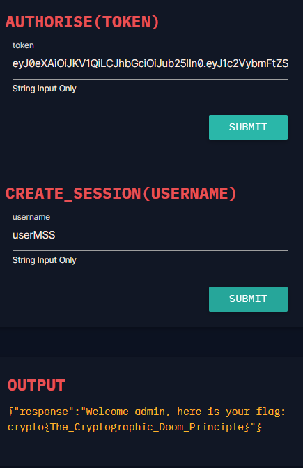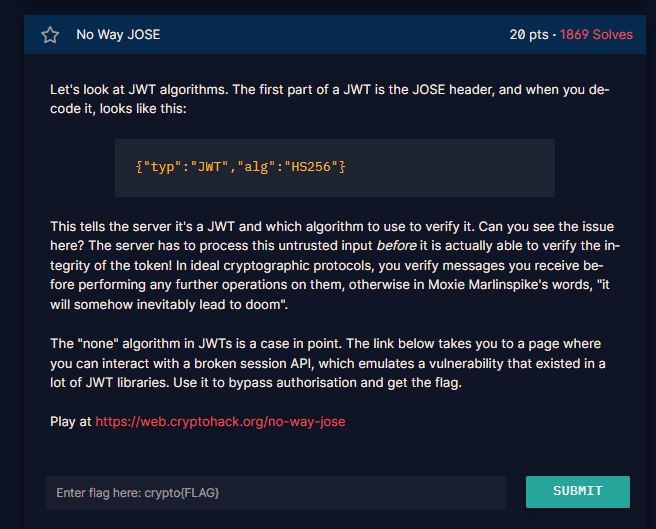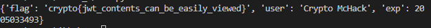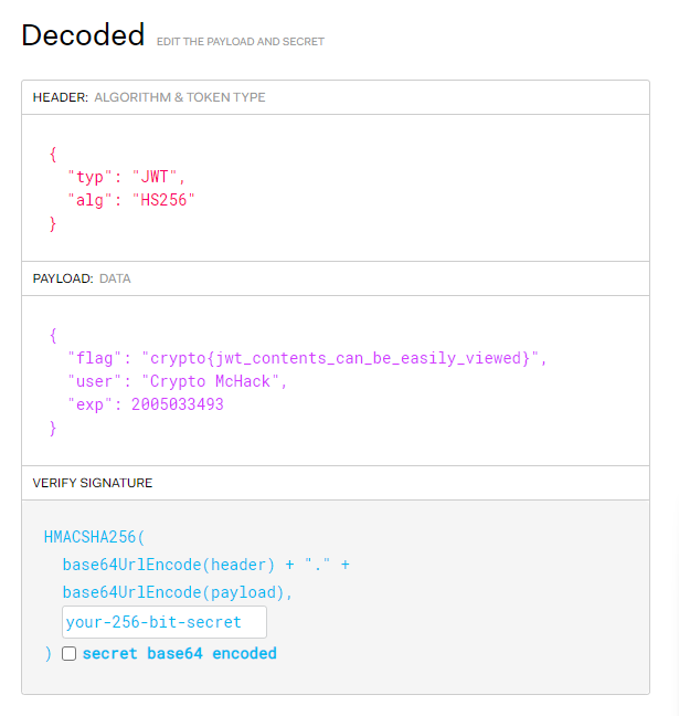 | eyJ0eXAiOiJKV1QiLCJhbGciOiJIUzI1NiJ9. eyJmbGFnIjoiY3J5cHRve2p3dF9jb250ZW50c19jYW5fYmVfZWFzaWx5X3ZpZXdlZH0iLCJ1c2VyIjoiQ3J5cHRvIE1jSGFjayIsImV4cCI6MjAwNTAzMzQ5M30. shKSmZfgGVvd2OSB2CGezzJ3N6WAULo3w9zCl_T47KQ |