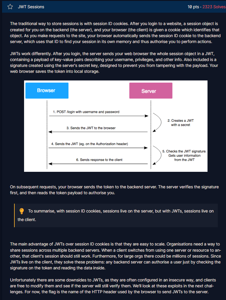 | 세션을 저장하는 전통적인 방법은 세션 ID 쿠키를 사용하는 것입니다. 웹 사이트에 로그인하면 백엔드(서버)에 세션 개체가 생성되고 브라우저(클라이언트)에 해당 개체를 식별하는 쿠키가 제공됩니다. 사이트에 요청할 때 브라우저는 자동으로 세션 ID 쿠키를 백엔드 서버로 전송합니다. 백엔드 서버는 이 ID를 사용하여 자신의 메모리에서 세션을 찾아 사용자에게 작업을 수행할 권한을 부여합니다. JWT는 다르게 작동합니다. 로그인한 후 서버는 사용자 이름, 권한 및 기타 정보를 설명하는 키-값 쌍의 페이로드가 포함된 JWT의 전체 세션 개체를 웹 브라우저에 보냅니다. 또한 서버의 비밀 키를 사용하여 작성된 서명도 포함되어 페이로드의 조작을 방지합니다. 웹 브라우저는 토큰을 로컬 저장소에 저장합니다. 이후 요청 시 브라우저는 토큰을 백엔드 서버로 보냅니다. 서버는 먼저 서명을 확인한 후 토큰 페이로드를 읽어 사용자에게 권한을 부여합니다. ![]() 이후 요청 시 브라우저는 토큰을 백엔드 서버로 보냅니다. 서버는 먼저 서명을 확인한 후 토큰 페이로드를 읽어 사용자에게 권한을 부여합니다. 💡요약하자면 세션아이디 쿠키는 서버에, JWT는 클라이언트에 세션이 생성 세션 ID 쿠키에 비해 JWT의 주요 장점은 확장이 쉽다는 것입니다. 조직들은 여러 백엔드 서버 간에 세션을 공유할 수 있는 방법이 필요합니다. 클라이언트가 한 서버 또는 리소스 사용에서 다른 서버로 전환하더라도 해당 클라이언트의 세션은 계속 작동합니다. 게다가, 큰 조직들의 경우 수백만 개의 세션이 있을 수 있습니다. JWT는 클라이언트에 상주하기 때문에 이러한 문제를 해결합니다. 토큰의 서명을 확인하고 내부의 데이터를 읽는 것만으로 백엔드 서버가 사용자에게 권한을 부여할 수 있습니다. 그러나 JWT는 종종 안전하지 않은 방식으로 구성될 수 있기 때문에 몇 가지 단점이 있으며, 고객은 자유롭게 JWT를 수정하고 서버가 여전히 확인할 수 있습니다. 이러한 악용 사례는 다음 과제에서 살펴보겠습니다. 그래서 플래그는 브라우저가 서버로 JWT를 보낼때 같이 보내는 헤더의 이름이다. |