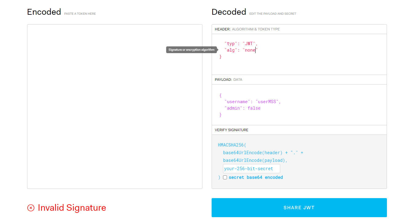 해당 사이트에선 알고리즘에 'none'이 적용이 안되어 인코딩이 안된 걸 볼 수 있다.