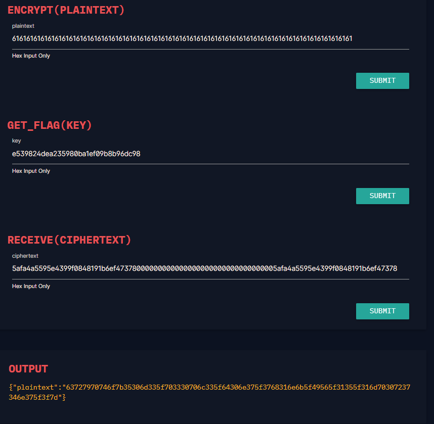 그리고 키를 사용하여 get_flag를 요청하면 플래그가 16진수로 반환되는데