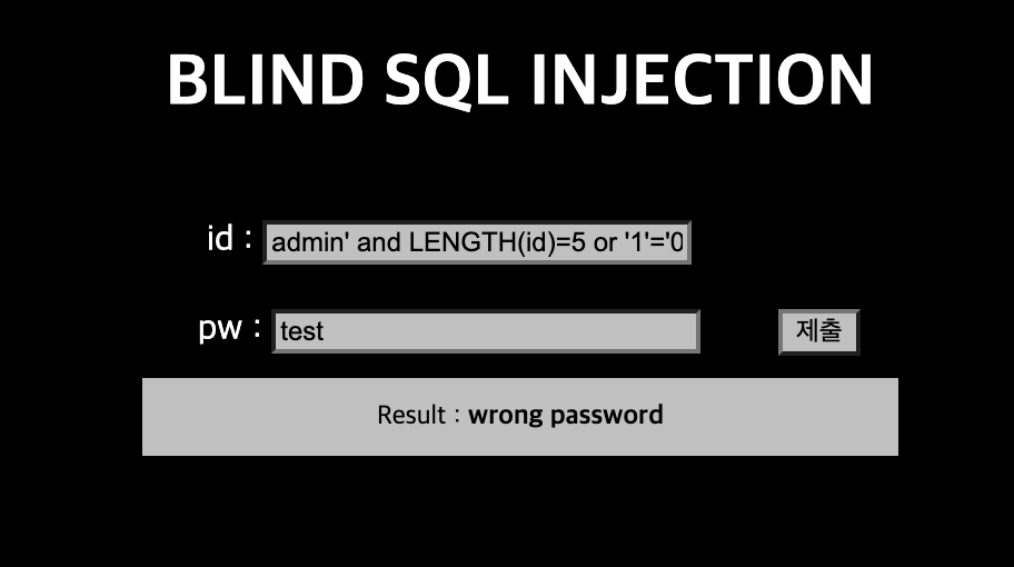 SQL Injection을 시도하였는데, wrong password라고 출력이 되었다. 이번엔 글자의 길이를 검사하는 SQL 쿼리를 삽입하면 어떻게 출력되는지 살펴봤다.