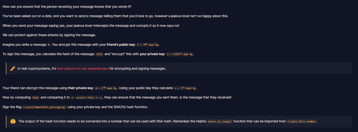 메시지를 받는 사람이 메시지를 작성했다는 것을 어떻게 확인할 수 있습니까? 당신은 데이트 신청을 받았고, 당신은 그들에게 가고 싶다고 메시지를 보내고 싶어하지만 질투심 많은 연인은 이것을 별로 좋아하지 않습니다. 당신이 좋다고 메시지를 보내면, 질투심 많은 애인이 메시지를 가로채서 그것을 손상시켜서 이제는 아니라고 말합니다! 메시지에 서명함으로써 이러한 공격으로부터 보호할 수 있습니다. 당신이 M 메시지를 쓴다고 상상해 보세요. 당신은 친구의 공개 키인 C = Me0 mod N0으로 이 메시지를 암호화합니다. 이 메시지에 서명하려면 메시지 H(M)의 해시를 계산하고 이 해시를 개인 키 S = H(M)d1 mod N1로 "암호화"합니다. 실제 암호화 시스템에서는 메시지를 암호화하고 서명하는 데 별도의 키를 사용하는 것이 좋습니다. 친구는 개인 키(m = Cd0 mod N0)를 사용하여 메시지의 암호를 해독할 수 있습니다. 공개 키를 사용하여 = Se1 모드 N1을 계산합니다. 이제 H(m)를 계산하고 s : assert H(m) == s 와 비교하여 사용자가 보낸 메시지가 자신이 받은 메시지임을 확인할 수 있습니다! 개인 키와 SHA256 해시 함수를 사용하여 플래그 crypto{Imut4ble_m3ssag1ng}에 서명합니다. 해시 함수의 출력은 RSA 연산에 사용할 수 있는 숫자로 변환해야 합니다. Crypto.Util.number에서 가져올 수 있는 유용한 bytes_to_long() 함수를 기억하십시오. |