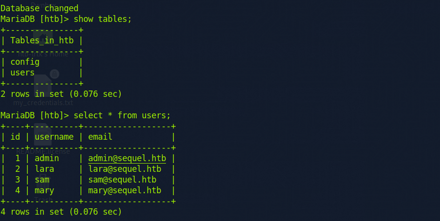 htb 데이터베이스의 users 테이블을 확인하였지만, flag 값이 존재하지 않았다.