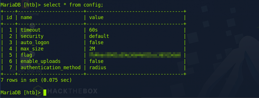 htb 데이터베이스의 나머지 테이블인 config 테이블에서 확인하니, flag 값이 존재하는 것을 확인할 수 있었다.