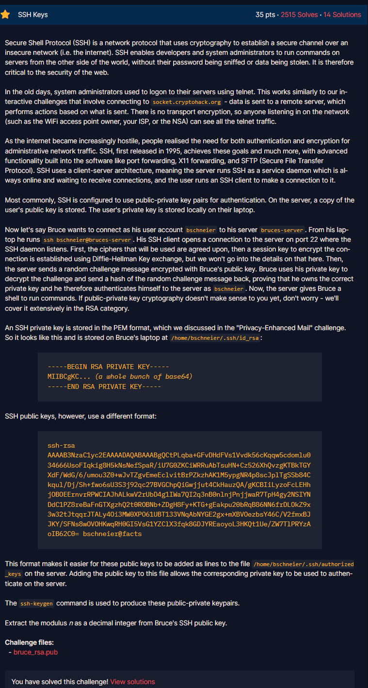 이제 브루스가 사용자 계정인 bschneier로 bruces-server에 연결하려고 합시다. 노트북에서 ssh bschneier@bruces-server를 실행합니다. SSH 클라이언트는 SSH 데몬이 듣고 있는 포트 22로 서버에 연결을 엽니다. 먼저 사용할 암호화 알고리즘을 합의한 다음 Diffie-Hellman 키 교환을 사용하여 연결을 암호화하는 세션 키가 설정됩니다(이에 대한 자세한 내용은 다루지 않을 것입니다). 그런 다음 서버는 브루스의 공개 키로 암호화된 임의의 도전 메시지를 보냅니다. 브루스는 개인 키를 사용하여 도전 메시지를 복호화하고 임의의 도전 메시지의 해시를 보내어 올바른 개인 키를 소유하고 있음을 증명하여 bschneier로 서버에 인증합니다. 이제 서버는 브루스에게 명령을 실행할 수 있는 셸을 제공합니다. 공개-개인 키 암호화가 아직 이해되지 않는다면 걱정하지 마세요. RSA 범주에서 상세히 다룰 것입니다.