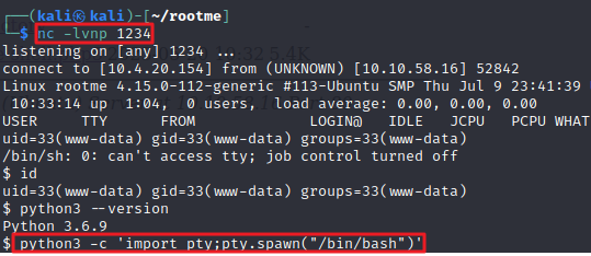 | 해당 명령어는 파이썬의 `pty` 모듈을 사용하여 쉘을 스폰(spawn)하는 명령어입니다. `pty`는 "pseudo terminal"의 약자로서, 프로세스 간 통신을 위해 가상 터미널 환경을 생성하는 데 사용됩니다. `import pty; pty.spawn("/bin/bash")`는 파이썬 인터프리터에서 실행하는 명령어로, `/bin/bash` 쉘을 가상 터미널로 생성하고 현재 터미널 세션과의 상호작용을 제공합니다. 이렇게 하면 파이썬 인터프리터가 아닌 실제 쉘로 전환됩니다. 이 명령어를 사용하면 현재 실행 중인 프로세스에서 쉘 환경을 얻을 수 있습니다. 쉘을 스폰한 후에는 명령어를 실행하고 출력을 보거나 입력을 받을 수 있습니다. 이를 통해 보다 효율적으로 명령어를 실행하고 명령어 결과를 확인할 수 있습니다. 주의할 점은 이 명령어는 사용자의 권한을 따르므로, 현재 사용자가 실행하는 프로세스에 할당된 권한으로 `/bin/bash` 쉘을 실행합니다. 따라서 명령어를 실행하는 사용자의 권한에 따라 쉘의 실행 권한도 결정됩니다. |