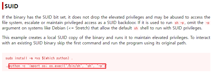 해당 파일을 다운 받고 실행권한을 부여하여 실행해 보면 SUID, SGID가 설정된 파일이 python임을 알 수 있다.