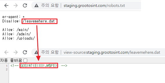 추가로 항상 국룰처럼 페이지에 접근하면 아무것도 보이지 않지만, 페이지 소스보기를 통해 첫번째 플래그 값을 확인해 볼 수 있었다.