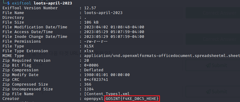 다운받은 후, 전시간에 배웠던 exiftool을 통하여 파일 정보를 확인해보니, 아래 세번째 플래그를 확인해 볼 수 있었다.