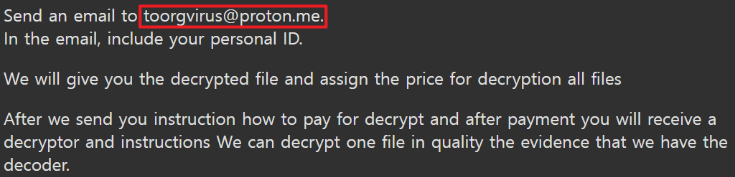 → 본문의 랜섬노트를 보아 이메일은 'toorgvirus@proton.me'이라는 것을 알 수 있다.
