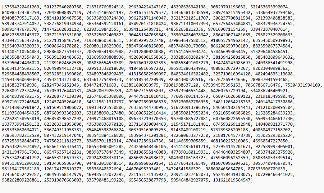 ciphertext = [67594220461269, 501237540280788, 718316769824518, 296304224247167, 48290626940198, 30829701196032, 521453693392074, 840985324383794, 770420008897119, 745131486581197, 729163531979577, 334563813238599, 289746215495432, 538664937794468, 894085795317163, 983410189487558, 863330928724430, 996272871140947, 352175210511707, 306237700811584, 631393408838583, 589243747914057, 538776819034934, 365364592128161, 454970171810424, 986711310037393, 657756453404881, 388329936724352, 90991447679370, 714742162831112, 62293519842555, 653941126489711, 448552658212336, 970169071154259, 339472870407614, 406225588145372, 205721593331090, 926225022409823, 904451547059845, 789074084078342, 886420071481685, 796827329208633, 433047156347276, 21271315846750, 719248860593631, 534059295222748, 879864647580512, 918055794962142, 635545050939893, 319549343320339, 93008646178282, 926080110625306, 385476640825005, 483740420173050, 866208659796189, 883359067574584, 913405110264883, 898864873510337, 208598541987988, 23412800024088, 911541450703474, 57446699305445, 513296484586451, 180356843554043, 756391301483653, 823695939808936, 452898981558365, 383286682802447, 381394258915860, 385482809649632, 357950424436020, 212891024562585, 906036654538589, 706766032862393, 500658491083279, 134746243085697, 240386541491998, 850341345692155, 826490944132718, 329513332018620, 41046816597282, 396581286424992, 488863267297267, 92023040998362, 529684488438507, 925328511390026, 524897846090435, 413156582909097, 840524616502482, 325719016994120, 402494835113608, 145033960690364, 43932113323388, 683561775499473, 434510534220939, 92584300328516, 763767269974656, 289837041593468, 11468527450938, 628247946152943, 8844724571683, 813851806959975, 72001988637120, 875394575395153, 70667866716476, 75304931994100, 226809172374264, 767059176444181, 45462007920789, 472607315695803, 325973946551448, 64200767729194, 534886246409921, 950408390792175, 492288777130394, 226746605380806, 944479111810431, 776057001143579, 658971626589122, 231918349590349, 699710172246548, 122457405264610, 643115611310737, 999072890586878, 203230862786955, 348112034218733, 240143417330886, 927148962961842, 661569511006072, 190334725550806, 763365444730995, 516228913786395, 846501182194443, 741210200995504, 511935604454925, 687689993302203, 631038090127480, 961606522916414, 138550017953034, 932105540686829, 215285284639233, 772628158955819, 496858298527292, 730971468815108, 896733219370353, 967083685727881, 607660822695530, 650953466617730, 133773994258132, 623283311953090, 436380836970128, 237114930094468, 115451711811481, 674593269112948, 140400921371770, 659335660634071, 536749311958781, 854645598266824, 303305169095255, 91430489108219, 573739385205188, 400604977158702, 728593782212529, 807432219147040, 893541884126828, 183964371201281, 422680633277230, 218817645778789, 313025293025224, 657253930848472, 747562211812373, 83456701182914, 470417289614736, 641146659305859, 468130225316006, 46960547227850, 875638267674897, 662661765336441, 186533085001285, 743250648436106, 451414956181714, 527954145201673, 922589993405001, 242119479617901, 865476357142231, 988987578447349, 430198555146088, 477890180119931, 844464003254807, 503374203275928, 775374254241792, 346653210679737, 789242808338116, 48503976498612, 604300186163323, 475930096252359, 860836853339514, 994513691290102, 591343659366796, 944852018048514, 82396968629164, 152776642436549, 916070996204621, 305574094667054, 981194179562189, 126174175810273, 55636640522694, 44670495393401, 74724541586529, 988608465654705, 870533906709633, 374564052429787, 486493568142979, 469485372072295, 221153171135022, 289713227465073, 952450431038075, 107298466441025, 938262809228861, 253919870663003, 835790485199226, 655456538877798, 595464842927075, 191621819564547]