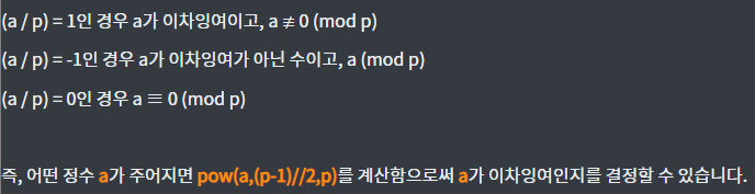 https://mokpo.tistory.com/634#:~:text=%EC%A6%89%2C%C2%A0%EC%96%B4%EB%96%A4%C2%A0%EC%A0%95%EC%88%98%C2%A0a%EA%B0%80%C2%A0%EC%A3%BC%EC%96%B4%EC%A7%80%EB%A9%B4%C2%A0pow(a%2C(p%2D1)//2%2Cp)%EB%A5%BC%C2%A0%EA%B3%84%EC%82%B0%ED%95%A8%EC%9C%BC%EB%A1%9C%EC%8D%A8%C2%A0a%EA%B0%80%C2%A0%EC%9D%B4%EC%B0%A8%EC%9E%89%EC%97%AC%EC%9D%B8%EC%A7%80%EB%A5%BC%C2%A0%EA%B2%B0%EC%A0%95%ED%95%A0%C2%A0%EC%88%98%C2%A0%EC%9E%88%EC%8A%B5%EB%8B%88%EB%8B%A4.