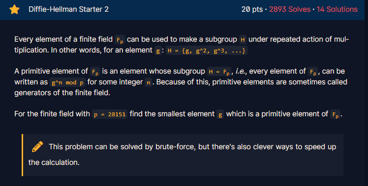 Season 1/워게임 [CryptoHack] DIFFIE-HELLMAN (Diffie-Hellman Starter 1, 2) 작성자 - ikbak_2 Diffie-Hellman Starter 1 문제 및 설명 정수 모듈로 n으로 이루어진 집합은 덧셈과 곱셈의 연산을 포함하여 링(Ring)이 됩니다. 이는 집합 내의 두 요소를 더하거나 곱하는 경우에도 집합 내의 다른 요소가 반환된다는 것을 의미합니다.모듈러스가 소수일 때: n = p인 경우, 우리는 집합 내의 모든 요소에 대한 역원을 보장받으며, 이로 인해 링은 필드(Field)로 승격됩니다. 이 필드를 유한체 Fp라고 합니다.Diffie-Hellman 프로토콜은 일반적으로 큰 소수인 유한체 Fp의 요소들로 작동합니다.소수 p = 991과 요소 g = 209가 주어진 경우, g * d mod 991 = 1을 만족하는 역원 d를 찾아보겠습니다. 풀이 더보기 g * d mod 991 = 1에 대한 역원 d는 inverse 함수로 구할수 있다. from Crypto.Util.number import inverse print(inverse(209, 991)) 답은 569이다. Diffie-Hellman Starter 2 문제 유한체 Fp의 모든 요소는 곱셈의 반복적인 작용으로 생성된 부분집합 H를 만들기 위해 사용될 수 있습니다. 다른 말로, 요소 g: H = {g, g^2, g^3, ...}입니다.Fp의 원시 원소(Primitive Element)는 부분집합 H = Fp를 만족하는 요소입니다. 즉, Fp의 모든 요소는 어떤 정수 n에 대해 g^n mod p로 표현될 수 있습니다. 이러한 이유로 원시 원소는 종종 유한체의 생성자(Generator)로도 불립니다.p = 28151인 유한체에 대해, Fp의 원시 원소 중 가장 작은 요소 g를 찾아보겠습니다.✍이 문제는 브루트 포스를 통해 풀수 있지만, 다른 계산에 대하여 괜찮은 방법으로 풀수 있습니다. 풀이 더보기 해당 문제는 sage math를 통해 primitive_element함수를 사용하여 가장 작은 요소인 g값을 찾을 수 있다. print(GF(28151).primitive_element()) https://cocalc.com/features/sage?utm_source=sagemath.org&utm_medium=icon 답은 7이다. 공유하기 게시글 관리 MSS 저작자표시 비영리 (새창열림) 'Season 1 > 워게임' 카테고리의 다른 글 [CryptoHack] DIFFIE-HELLMAN (Diffie-Hellman Starter 3, 4, 5) (0) 2023.06.28 일단 배워보는 정보수집(2) (0) 2023.06.25 [CryptoHack] Mathmatics (Adrien's Signs) (0) 2023.05.30 [CryptoHack] MATHEMATICS (Modular Square Root) (0) 2023.05.29 일단 배워보는 정보수집(1) (0) 2023.05.29 Contents 당신이 좋아할만한 콘텐츠 [CryptoHack] DIFFIE-HELLMAN (Diffie-Hellman Starter 3, 4, 5) 2023.06.28 일단 배워보는 정보수집(2) 2023.06.25 [CryptoHack] Mathmatics (Adrien's Signs) 2023.05.30 [CryptoHack] MATHEMATICS (Modular Square Root) 2023.05.29 댓글 0 + 이전 댓글 더보기