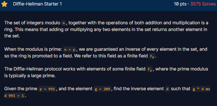 Season 1/워게임 [CryptoHack] DIFFIE-HELLMAN (Diffie-Hellman Starter 1, 2) 작성자 - ikbak_2 Diffie-Hellman Starter 1 문제 및 설명 정수 모듈로 n으로 이루어진 집합은 덧셈과 곱셈의 연산을 포함하여 링(Ring)이 됩니다. 이는 집합 내의 두 요소를 더하거나 곱하는 경우에도 집합 내의 다른 요소가 반환된다는 것을 의미합니다.모듈러스가 소수일 때: n = p인 경우, 우리는 집합 내의 모든 요소에 대한 역원을 보장받으며, 이로 인해 링은 필드(Field)로 승격됩니다. 이 필드를 유한체 Fp라고 합니다.Diffie-Hellman 프로토콜은 일반적으로 큰 소수인 유한체 Fp의 요소들로 작동합니다.소수 p = 991과 요소 g = 209가 주어진 경우, g * d mod 991 = 1을 만족하는 역원 d를 찾아보겠습니다. 풀이 더보기 g * d mod 991 = 1에 대한 역원 d는 inverse 함수로 구할수 있다. from Crypto.Util.number import inverse print(inverse(209, 991)) 답은 569이다. Diffie-Hellman Starter 2 문제 유한체 Fp의 모든 요소는 곱셈의 반복적인 작용으로 생성된 부분집합 H를 만들기 위해 사용될 수 있습니다. 다른 말로, 요소 g: H = {g, g^2, g^3, ...}입니다.Fp의 원시 원소(Primitive Element)는 부분집합 H = Fp를 만족하는 요소입니다. 즉, Fp의 모든 요소는 어떤 정수 n에 대해 g^n mod p로 표현될 수 있습니다. 이러한 이유로 원시 원소는 종종 유한체의 생성자(Generator)로도 불립니다.p = 28151인 유한체에 대해, Fp의 원시 원소 중 가장 작은 요소 g를 찾아보겠습니다.✍이 문제는 브루트 포스를 통해 풀수 있지만, 다른 계산에 대하여 괜찮은 방법으로 풀수 있습니다. 풀이 더보기 해당 문제는 sage math를 통해 primitive_element함수를 사용하여 가장 작은 요소인 g값을 찾을 수 있다. print(GF(28151).primitive_element()) https://cocalc.com/features/sage?utm_source=sagemath.org&utm_medium=icon 답은 7이다. 공유하기 게시글 관리 MSS 저작자표시 비영리 (새창열림) 'Season 1 > 워게임' 카테고리의 다른 글 [CryptoHack] DIFFIE-HELLMAN (Diffie-Hellman Starter 3, 4, 5) (0) 2023.06.28 일단 배워보는 정보수집(2) (0) 2023.06.25 [CryptoHack] Mathmatics (Adrien's Signs) (0) 2023.05.30 [CryptoHack] MATHEMATICS (Modular Square Root) (0) 2023.05.29 일단 배워보는 정보수집(1) (0) 2023.05.29 Contents 당신이 좋아할만한 콘텐츠 [CryptoHack] DIFFIE-HELLMAN (Diffie-Hellman Starter 3, 4, 5) 2023.06.28 일단 배워보는 정보수집(2) 2023.06.25 [CryptoHack] Mathmatics (Adrien's Signs) 2023.05.30 [CryptoHack] MATHEMATICS (Modular Square Root) 2023.05.29 댓글 0 + 이전 댓글 더보기