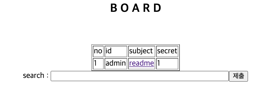 검색 기능을 보기위해 admin, guest, hi~, readme를 입력해봤지만, 모두 위와 같이 결과가 출력되었다.