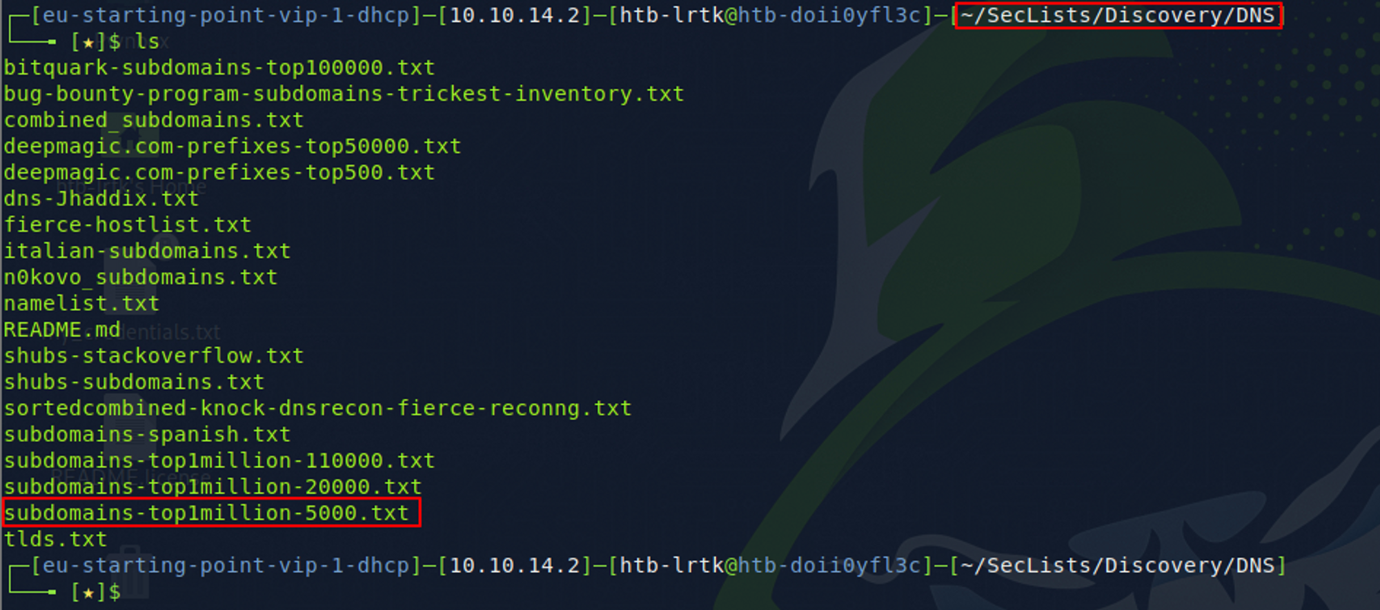 DNS 디렉터리의 subdomains-top1million-5000.txt 파일을 사용하여, 서브도메인을 스캔하도록 하겠다.