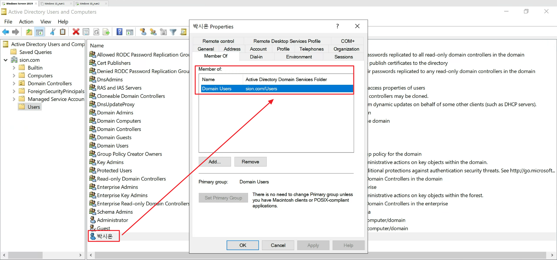 Season 1/기술 보안 [Active Directory] 2장. AD 설치 및 AD Join 작성자 - S1ON 개요 이번 장에서는 AD 도메인 서버를 설치 및 구성해보고 동일한 네트워크에 구성된 단말PC에 AD Join(컴퓨터를 AD 도메인에 가입시키는 작업)을 수행해보자. 환경구성 구분 운영체제 용도 비고 VMware Windows Server 2019 AD 서버 *Administrator Windows 10 AD 관리자 단말1 *Domain Users AD 설치 ① Windows Server에 AD DS(Active Directory Domain Services) 설치 ㅇ 경로: Server Manager > Manage > Add Roles and Features - 서버 매니저에서 Add Roles And Features 클릭 - Server Roles에서 AD DS(Active Directory Domain Services) 선택 후, NEXT 클릭 - AD DS 필수 구성요소 설치 확인 ② AD 도메인 구성정보 입력 ㅇ 경로: Server Manager > Notification > Promote this server to a domain controller - 알림에서 Promote this server to a domain controller 링크 클릭 - Deployment Configuration에서 새로운 Forest를 추가하고 Root Domain Name 입력 후, Next 클릭 - Domain Controller Options에서 DNS 서버를 포함 및 복구 패스워드를 입력하고 Next 클릭 - AD DS 구성 옵션 확인 - AD DS 및 DNS 서버 설치 확인 AD Join (AD 도메인 가입) ① AD 도메인 단말 DNS 서버 설정 ㅇ 경로: 제어판 > 네트워크 및 인터넷 > 네트워크 연결 > Ethernet0 속성 > 인터넷 프로토콜 버전 4 속성 - AD 서버(DNS) IP(192.168.154.145) 확인 - AD 사용자 단말 동일 네트워크 확인 및 DNS 서버 주소(AD DNS 서버: 192.168.154.145) 변경 ② ADUC(Active Directory Users and Computers)를 통해 사용자 계정 생성 ㅇ 경로: Server Manager > Tools > Active Directory Users and Computers - 서버 매니저에서 Active Directory Users and Computers 클릭 - 생성 도메인(sion.com)의 기본 생성 계정(Administrator, Guest) 확인 - Users를 클릭하여 사용자 계정 추가 - 추가하고자 하는 사용자 정보 입력 - 사용자 계정 생성 확인 및 Default 권한 확인 ③ 사용자 단말에서 AD Join(도메인 가입) 수행 ㅇ 경로: 설정 > 시스템 > 정보 > 고급 시스템 설정 > 컴퓨터 이름 > 변경 192 - 위에서 생성한 AD 도메인 이름으로 소속 그룹 변경 - 위에서 생성한 사용자 계정(11111111)으로 로그인 ※ 사용자 계정 생성 시, user must change the password at next logon을 체크했기 때문에 AD 조인이 실패하여 ADCU에서 해당 계정의 정책을 제거 후 진행함 - Windows 인증 시, AD 사용자 계정으로 로그인 시도 - net /domain user 명령어를 이용하여 AD 도메인에 정상 조인됨을 확인 공유하기 게시글 관리 MSS 저작자표시 비영리 (새창열림) 'Season 1 > 기술 보안' 카테고리의 다른 글 CVE-2014-0497 Adobe Flash Player Integer Underflow Remote Code Execution (0) 2023.08.29 안드로이드 모바일 취약점 진단 환경 구축 (인시큐어뱅크) (0) 2023.07.31 [Active Directory] 1장. AD의 개념과 특징 (0) 2023.07.25 [IOS] 탈옥 이후 진단환경 구성하기!! (0) 2023.06.30 [내부망 침투] 정보보호시스템 관리자페이지 경로_v1.0 (0) 2023.06.30 Contents 당신이 좋아할만한 콘텐츠 CVE-2014-0497 Adobe Flash Player Integer Underflow Remote Code Execution 2023.08.29 안드로이드 모바일 취약점 진단 환경 구축 (인시큐어뱅크) 2023.07.31 [Active Directory] 1장. AD의 개념과 특징 2023.07.25 [IOS] 탈옥 이후 진단환경 구성하기!! 2023.06.30 댓글 19 + 이전 댓글 더보기