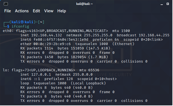 공격자(attacker)인 칼리리눅스의 IP 주소를 확인한다. IP 주소는 192.168.44.132 이다.