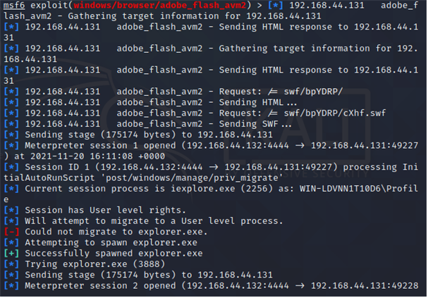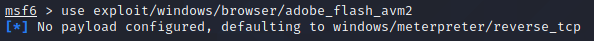 use exploit/windows/browser/adobe_flash_avm2 명령어를 사용하여서 adobe_flash_avm2 모듈을 작동한다,