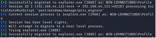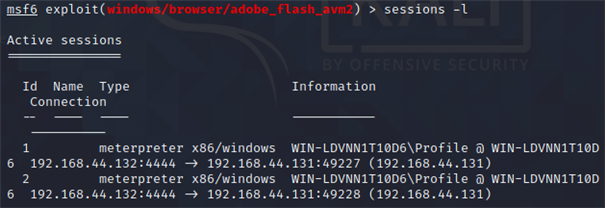session –l 명령어를 사용해서 사용할 수 있는 원격 세션의 리스트를 볼 수 있다. 아래의 사진으로 봤을 때 192.168.44.132(공격자 주소)에서 192.168.44.131(피해자 주소)로 원격을 할 수 있는 목록이 2개가 있다는 것을 확인할 수 있다.