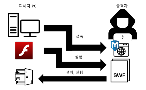 먼저 칼리 리눅스에서 Metasploit을 활용하여 악성행위를 하는 swf를 가지고 있는 사이트를 만들어낸다. 피해자PC사용자는 해당 사이트를 접속하게 되면, 악성 swf파일이 실행이 되면서, 윈도우 시스템에 침투하고 관리자 모드 권한을 획득한 다음, 윈도우 시스템을 장악한다. 이를 위해서는 윈도우 7에 백도어 파일을 설치하고 실행시킨다. 해당 시나리오를 그림으로 표현하면 아래와 같다.