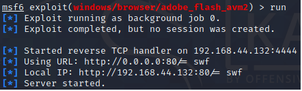 run 키워드를 사용하면, 해당 사이트가 만들어지며 공격을 준비하게 된다. 만약 실제 상황이라면 워터링 홀 공격처럼 한 사이트를 해킹하여 플래시 이미지를 백그라운드에 넣어 적용이 가능하다.