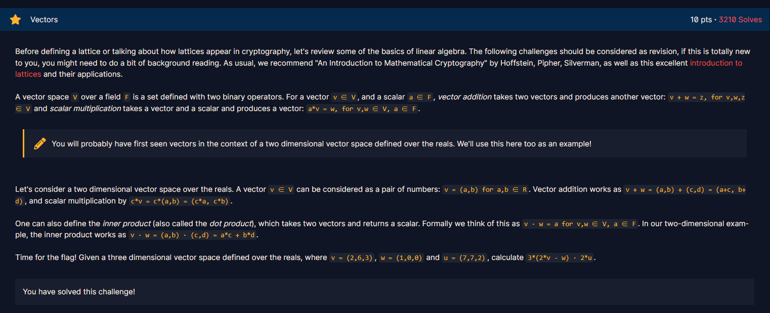 먼저 격자를 정의하거나 암호학에서 격자가 어떻게 나타나는지에 대해 이야기하기 전에, 선형 대수의 기본 사항을 살펴보겠습니다. 다음 도전 과제들은 복습으로 간주되어야 하며, 만약 이것이 완전히 처음이라면 약간의 백그라운드 독서가 필요할 수 있습니다. 여전히 우리는 "수학적 암호학 입문" (Hoffstein, Pipher, Silverman) 및 격자 및 그 응용에 대한 이 훌륭한 소개를 추천합니다.
