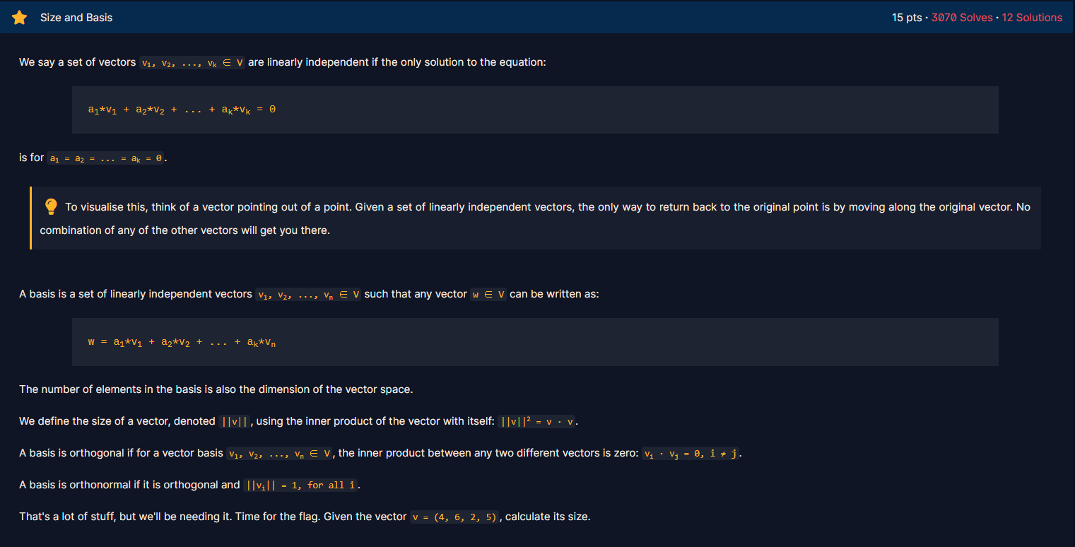 카테고리 없음 [CryptoHack] MATHMATICS(Size and Basis) 작성자 - ikbak_2 Size and Basis 문제(및 설명) 우리는 벡터 v1, v2, ..., vk ∈ V의 집합이 선형 독립이라고 말합니다. 만약 방정식의 유일한 해가 다음과 같다면: a1v1 + a2v2 + ... + ak*vk = 0 a1 = a2 = ... = ak = 0일 때입니다. 이를 시각화하려면 점에서 벡터가 밖으로 향하는 것으로 생각하세요. 선형 독립 벡터의 집합이 주어지면 원래 점으로 돌아가는 유일한 방법은 원래 벡터를 따라 이동하는 것입니다. 다른 어떤 벡터들의 조합도 원래 지점으로 도달할 수 없습니다. 기저(basis)는 v1, v2, ..., vn ∈ V의 선형 독립 벡터 집합으로, 어떤 벡터 w ∈ V도 다음과 같이 작성할 수 있을 때입니다: w = a1v1 + a2v2 + ... + ak*vn 기저의 요소 수는 벡터 공간의 차원이기도 합니다. 우리는 벡터의 크기를 ||v||로 표시하며, 이는 벡터 자신과의 내적을 사용하여 정의됩니다: ||v||2 = v ∙ v. 기저가 직교성(orthogonal)을 갖는 경우, 벡터 기저 v1, v2, ..., vn ∈ V의 어떤 두 벡터 사이의 내적은 0입니다: vi ∙ vj = 0, i ≠ j. 기저가 정규직교(orthonormal)인 경우, 직교성을 갖고 ||vi|| = 1인 경우입니다. 이것은 많은 내용이지만, 이후에 필요할 것입니다. 이제 플래그를 찾아보겠습니다. 벡터 v = (4, 6, 2, 5)가 주어진 경우, 그 크기를 계산하세요. 풀이 더보기 from numpy import * v = array((4, 6, 2, 5)) print(sqrt(dot(v,v))) 답은 9이다. 공유하기 게시글 관리 MSS 저작자표시 비영리 (새창열림) Contents 댓글 0 + 이전 댓글 더보기