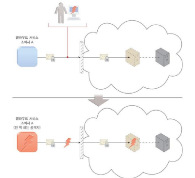 클라우드 서비스 소비자에 의해 사용된 안전도가 낮은 비밀번호에 의해 공격자가 소유한 악성 클라우드 서비스 소비자는 클라우드 기반 가상 서버로의 접근을 얻기 위해 클라우드 서비스 소비자인척 하도록 보일 수 있다.