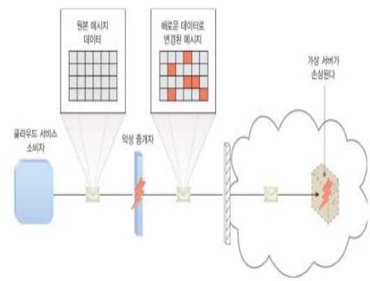 악성 서비스 에이전트는 클라우드 서비스 소비자가 가상 서버에서 제공하는 클라우드 서비스로 보내는 메시지를 가로채서 수정한다. 해로운 데이터가 메시지에 함께 포함되기 때문에 가상 서버는 손상을 입게 된다.