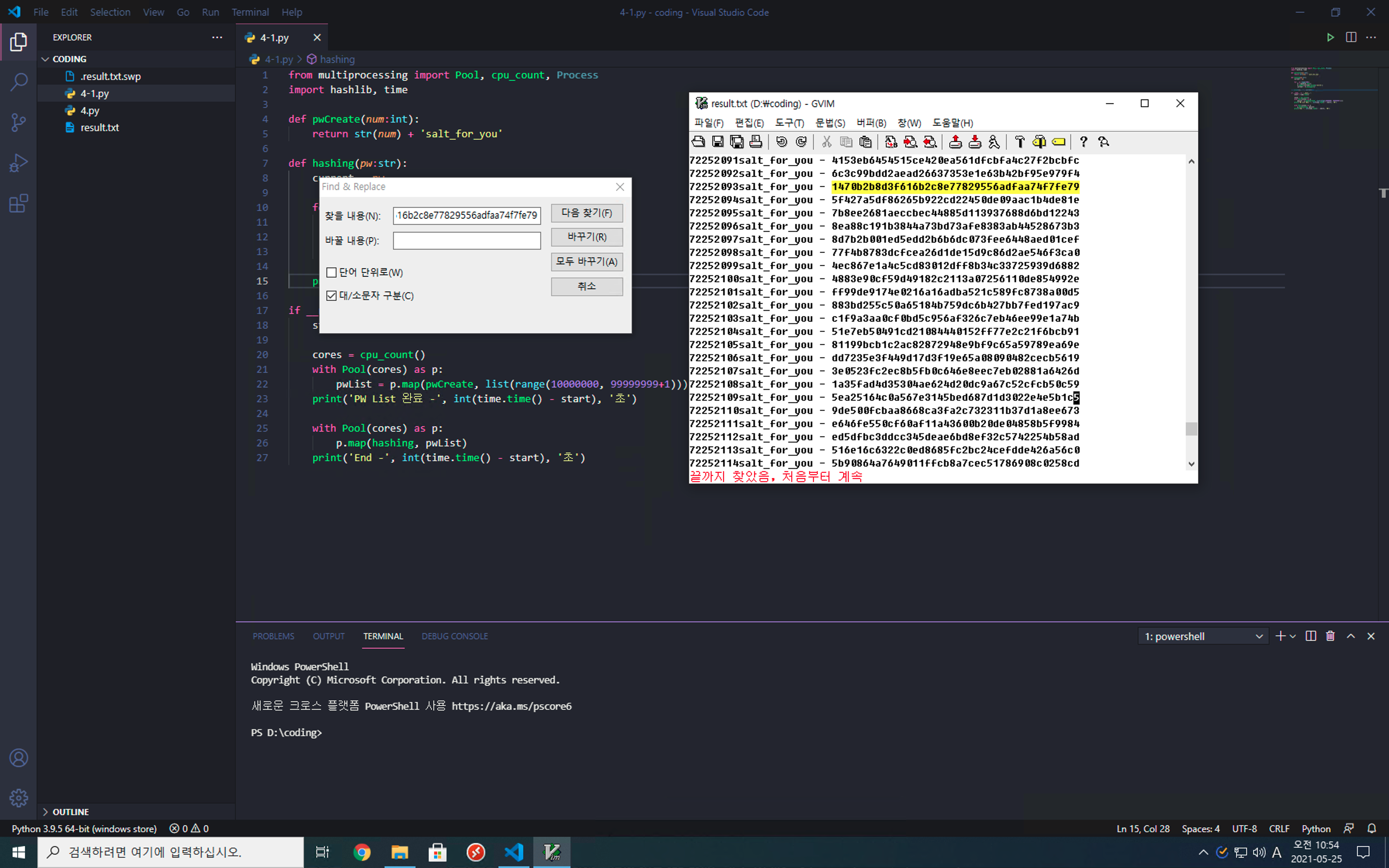 이러면, 코드를 짜서 해시값과 같은 값이 나올 때까지 돌릴 수 밖에 없다.