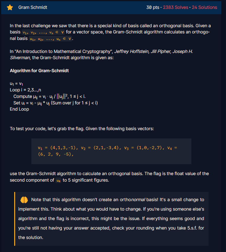 그램-슈미트 알고리즘을 사용하여 직교 기저를 계산하십시오. 플래그는 u4의 두 번째 성분의 부동 소수점 값을 5자리까지 표시한 것입니다.