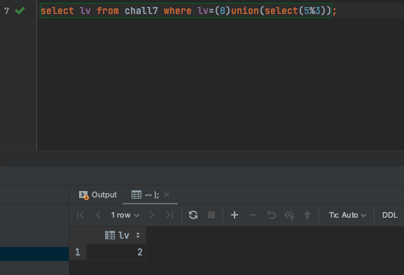 여러번 시도 끝에 where절의 lv가 false이고, 유니온으로 select 2를 연결 시키면 결과값이 2가 출력이 되었다.