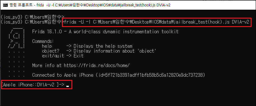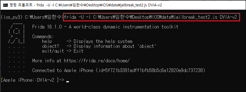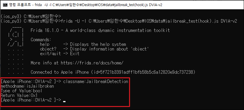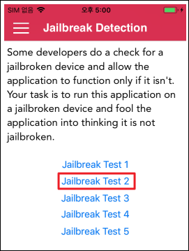 Season 1/기술 보안 [IOS] DVIA 를 통한 취약점 파헤치기!(Jailbreak Detection 3) 작성자 - 한수임 이번에는 Jailbreak Dection 3 으로 새로운 기법을 통해 탐지 우회를 해보도록 하겠습니다. Objective-C로 작성된 클래스 메소드를 프리다로 클래스 추출 > 메소드 추출 > 반환 값 확인 순으로 진행 하겠습니다. 처음 Jailbreak test2 선택 시 탈옥되었다고 확인 CMD를 통해 환경 구축 후 환경을 분석해 봅시다 frida 동작시킨 후 정상적으로 설치되어있는지 확인하며, 현재 실행중인 애플리케이션을 확인 합니다. 이후 클래스 네임을 가져오는 코드를 작성 합니다. 이후 frida 를 이용하여 -U (연결된 기기) -l (스크립트 삽입) 옵션을 통해 메소드 추출 | find 옵션을 주지 않으면 다른 많은 메소드 들이 출력 되므로 확인하기 쉽게 find 옵션 넣어 주었다. (이후 CMD 멈출 시 앱 종료 후 다시 실행) (출력 재지정을 통해 모든 클래스 텍스트 파일로 저장 후 해당 텍스트 파일에서 검색해도 됨.) 이후 메소드를 검색하는 코드 작성 프리다를 통해 해당 코드 실행 isJailbroken 메소드 반환 (+ 는 클래스에 대한 메소드, - 는 인스턴스에 대한 메소드) 후킹 코드를 작성 이후 후킹 코드 실행 아래와 같이 -> 나올 때 앱을 통해 Test2 클릭 해당 값 출력 확인 bool의 값은 True or False를 의미, 1 or 0 , 16진수로 1을 반환 16진수 1을 0으로 변환하여 탈옥탐지 우회 해볼 예정 해당 코드를 작성 이후 프리다 실행 이후 앱을 통해 Test 2 접근 버튼 클릭 시 탈옥 탐지 우회 가능 확인 리턴 값 정상적으로 변경 확인 frida ios github 등을 통해 후킹 코드 검색 가능 이번 실습도 끄읏~ Jailbreak 실습은 얼마 남지 않았습니다. 끝까지 화이팅~ 공유하기 게시글 관리 MSS 저작자표시 비영리 (새창열림) 'Season 1 > 기술 보안' 카테고리의 다른 글 암호 화폐를 추적해보자 (0) 2023.11.30 쿠버네티스 개념과 보안 위협 (0) 2023.11.30 C/S 프로그램 취약점 진단 환경 구축 (1) 2023.10.31 [pwn.college] Assembly Crash Course - Level 5 (0) 2023.10.01 [pwn.college] Assembly Crash Course - Level 4 (0) 2023.10.01 Contents 당신이 좋아할만한 콘텐츠 암호 화폐를 추적해보자 2023.11.30 쿠버네티스 개념과 보안 위협 2023.11.30 C/S 프로그램 취약점 진단 환경 구축 2023.10.31 [pwn.college] Assembly Crash Course - Level 5 2023.10.01 댓글 0 + 이전 댓글 더보기