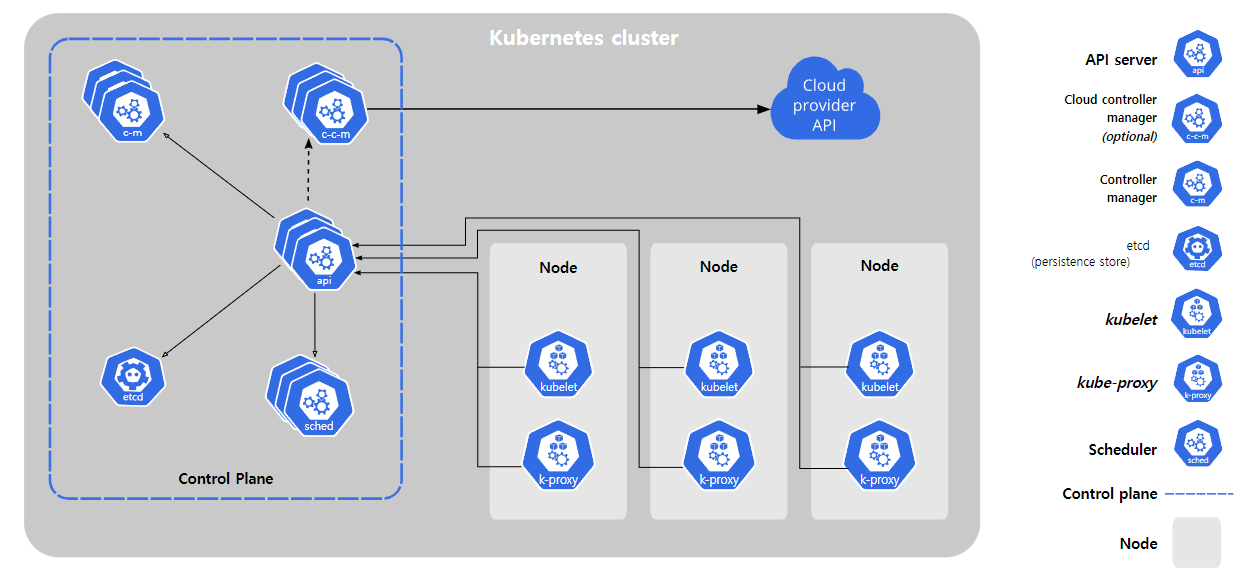 | API server | Control Plane의 핵심으로 클러스터 관리 명령, 데이터 검증 및 저장, 외부 접근 지점 제공 |