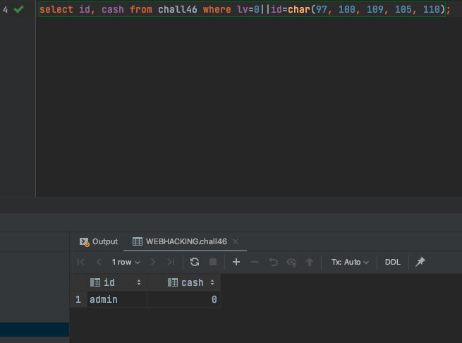 Season 1/워게임 [Webhacking.kr] Old - 46 Write Up 작성자 - LRTK Sqli 문제가 나왔다. <?php if($_GET['lv']){ $db = dbconnect(); $_GET['lv'] = addslashes($_GET['lv']); $_GET['lv'] = str_replace(" ","",$_GET['lv']); $_GET['lv'] = str_replace("/","",$_GET['lv']); $_GET['lv'] = str_replace("*","",$_GET['lv']); $_GET['lv'] = str_replace("%","",$_GET['lv']); if(preg_match("/select|0x|limit|cash/i",$_GET['lv'])) exit(); $result = mysqli_fetch_array(mysqli_query($db,"select id,cash from chall46 where lv=$_GET[lv]")); if($result){ echo("{$result['id']} information<br><br>money : {$result['cash']}"); if($result['id'] == "admin") solve(46); } } ?> 코드를 확인해보니, 입력값에 대한 검증이 몇가지 있었다. 입력값에 대한 검증- addshlashes : ', ", \, NUL- replace : 공백, /, *, %- preg_match : select, 0x, limit, cash위 검증을 우회하여, 쿼리문의 id 결과값을 admin으로 출력해야한다. Sqli를 진행하기 전 어떤 데이터가 있는지 확인해봤다. 1~4번까지 데이터가 있었고, 그 이후에는 출력이 되지 않았다.혹시 다른 ID를 SQL 함수로 admin을 만들 수 있지 않을까 했지만, 없는 것 같다. 확인을 끝냈으니, Sqli에 사용될 쿼리를 테스트하였다. 몇가지 방법을 시도 끝에 admin을 출력할 수 있었다.하지만, 쿼리에 공백과 작음따음표가 있어서 이를 우회해야한다. 나는 공백 검증을 우회하기 위해 or 대신에 ||를 사용하기로 했다. 작은 따음표는 Webhacking.kr 문제 풀이 중에 알아낸 Hex값을 넣으면 문자열로 반환되는 것처럼 Char 함수를 이용하기로 하였다.Hex는 현재 preg_match에서 검증하고 있기 때문에 사용하지 않았다. 출력이 잘 되는 것을 볼 수 있다.이를 서버로 보냈다. Flag를 얻을 수 있었다. 공유하기 게시글 관리 MSS 'Season 1 > 워게임' 카테고리의 다른 글 [Webhacking.kr] Old - 60 Write Up (0) 2021.05.27 [Webhacking.kr] Old - 49 Write Up (0) 2021.05.27 [Webhacking.kr] Old - 11 Write Up (0) 2021.05.27 Wargame.kr - WTF_CODE (0) 2021.05.27 [Webhacking.kr] Old - 7 Write Up (0) 2021.05.26 Contents 당신이 좋아할만한 콘텐츠 [Webhacking.kr] Old - 60 Write Up 2021.05.27 [Webhacking.kr] Old - 49 Write Up 2021.05.27 [Webhacking.kr] Old - 11 Write Up 2021.05.27 Wargame.kr - WTF_CODE 2021.05.27 댓글 0 + 이전 댓글 더보기