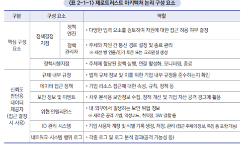 제로트러스트는 정보보호의 기본 원칙과 다를 바가 없다. 다른 점이라면 목표를 달성하기 위한 방법적 측면에서 기존 접근 방식이 적합하지 않기 때문에 이를 바꾸고자 하는 것이며 제로트러스트 아키텍처의 기본 원리는 이 관점에서 기술되어야 한다.